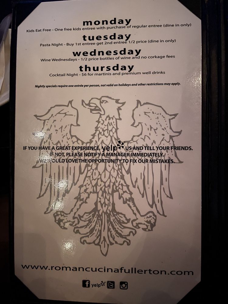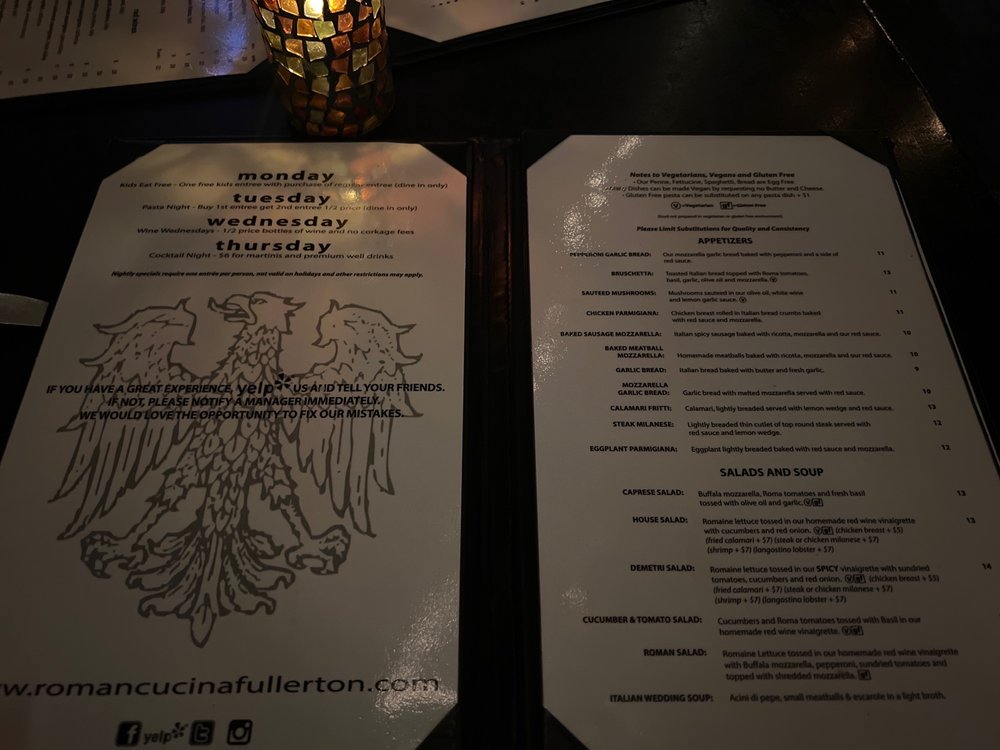 Roman Cucina, located in Fullerton, CA, offers a variety of amenities like takeout, reservations, and vegan options, making it a versatile dining spot. Customers rave about the attentive service and delicious food, with options ranging from pasta to meatballs. The cozy atmosphere and delicious drinks like the key lime martini create a vibrant and lively dining experience. The dimly lit setting adds to the restaurant's charm, making it a perfect spot for a romantic dinner or a family-friendly meal. With a diverse menu and welcoming staff, Roman Cucina is a must-visit spot for Italian cuisine lovers.